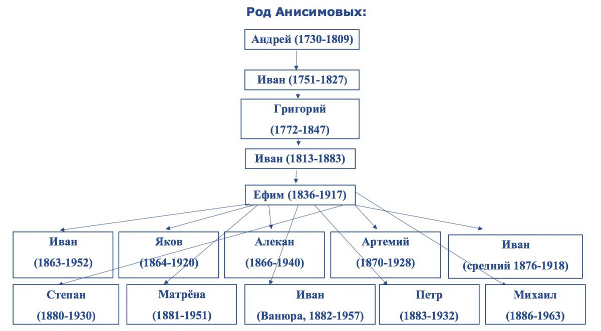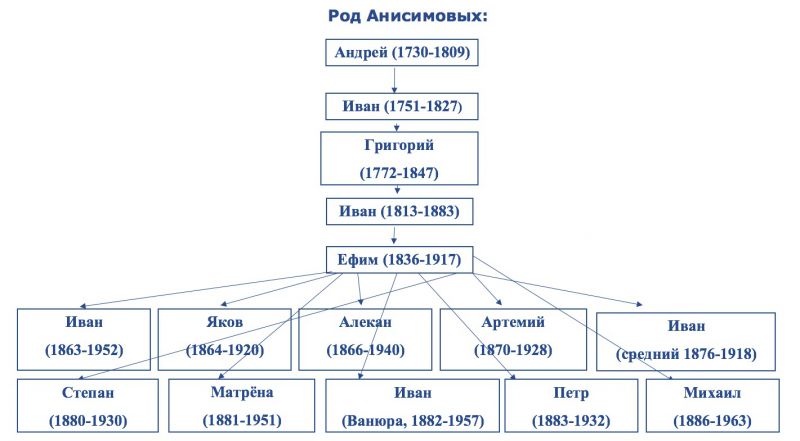 Прадед Ефим Иванович (1836-1917) был человек крепкий, серьезный, деловой, неразговорчивый и практичный. Вообще это родовые качества Анисимовых. У него было 9 сыновей и только одна дочь: Иван-старший (мой дедушка, 1863-1952), Яков (1864-1920), Алекан (1866-1940), Артемий (1870-1928), Иван-средний (1876-1918), Степан (1880-1930), Матрёна (1881- 1951), Иван (Ванюра, 1882-1957), Пётр (1883-1932), Михаил (1886-1963). Три сына именем «Иван» Ефим Иванович назвал в честь своего отца – Ивана Григорьевича (1813-1893). Иван Григорьевич был сильным, крупным, трудолюбивым, рассудительным, мудрым и добрым советчиком, очень уважаемым на селе человеком. Первому сыну, моему дедушке, сразу дали имя Иван. Рождение 9 сыновей позволило Ефиму прочно закрепить за родом статус зажиточного и в последующем владеть 103 десятинами (112 га) земли. Право на землю он покупал.