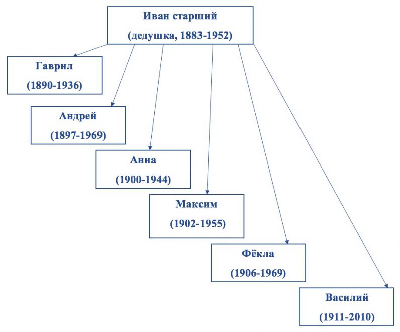 Перед коллективизацией в доме дедушки проживала большая семья из 27 человек: его мать Евдокия Константиновна Анисимова (Болгова, 1838-1936гг.); сын Гаврил с женой Олимпиадой и детьми Марией (1915 года рождения), Еленой (1918), Григорием (1921), Сергеем (1923); сын Андрей с женой Марфой Григорьевной и детьми Анной (1919), Николаем (1920), Марией и  Серафимой (1922), Ниной (1924); дочь Анна с мужем Иваном Дмитриевичем Батановым и детьми Ириной (1923) и Михаилом (1924); сын Максим (мой папа) с женой Анной Никитичной (Агибаловой) и детьми Валентином (1927), Юрием (1928), Ниной (1926 г.р., которая умерла в этом же году); дочь Фёкла (Фаина) с мужем Петром Петровичем Пахомовым (детей у них не было); сын Василий.