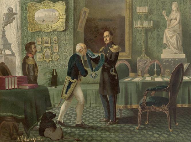 | «Император Николай I награждает Сперанского за составление свода законов» (орденом Андрея Первозванного). Картина Алексея Кившенко, начало 19 в. |