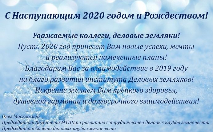 В Московской торгово-промышленной палате состоялось знаковое событие для представителей деловых клубов землячеств – первое вручение премий «Земляк года» – 2019. Учредителем премии выступил Совет деловых клубов землячеств и Комитет МТПП по развитию сотрудничества деловых клубов землячеств.