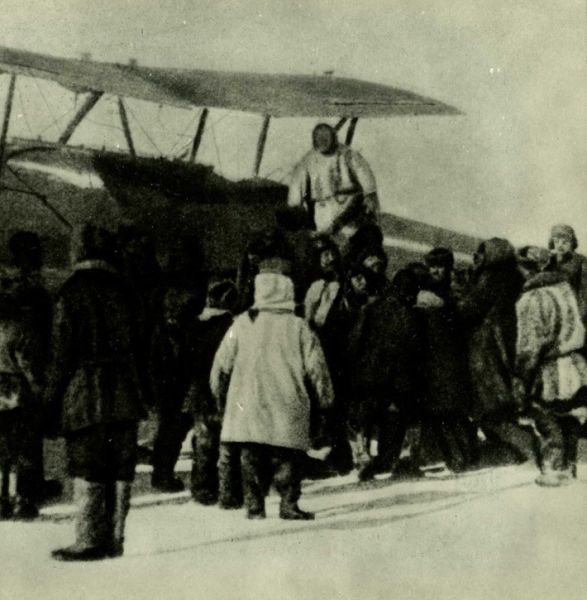 Посадка первых пассажиров ледового лагеря на самолет «АНТ-4» под управлением летчика А. Ляпидевского.
