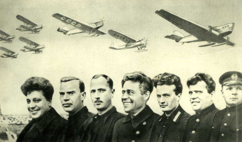Первые Герои Советского Союза – летчики, спасшие челюскинцев (слева направо):  А. Ляпидевский, С. Леваневский, М. Слепнев, В. Молоков, Н. Каманин, М. Водопьянов, И. Доронин.