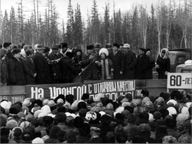 | Май 1978 года. Митинг, посвящённый прибытию первого поезда на станцию Ноябрьская. Выступает представитель коренного населения Пуровского района. Справа от выступающей Анатолий Максимович Анисимов. |