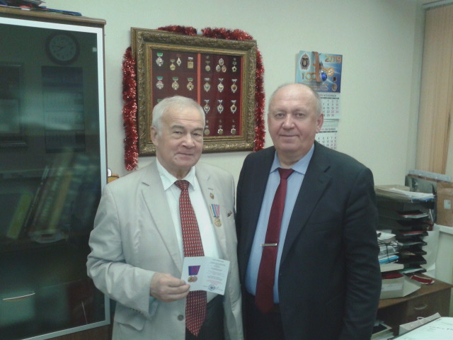 Слева направо: Кайман Замалетдинов и начальник отдела государственной службы и кадров Министерства энергетики РФ Игорь Буров после вручения медали. |