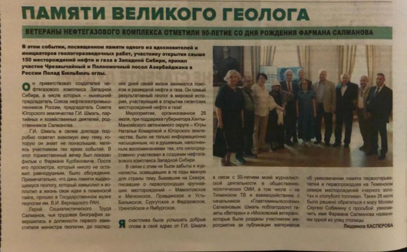 В свежем номере газеты "Московский ветеран" (N 22, 10.08., 4-я полоса) опубликована статья о событии, которое наше землячество (в числе активных организаторов мероприятия) отметило в связи с 90-летием выдающегося геолога Фармана Салманова.