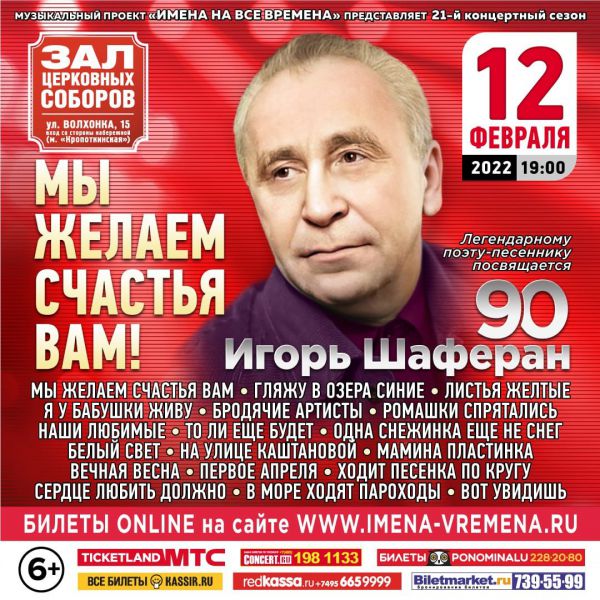 12 февраля 2022 года мы сходили в Большой зал церковных соборов Храма Христа Спасителя на юбилейный концерт в честь 90-летия знаменитого советского поэта-песенника Игоря Шаферана «Мы желаем счастья Вам!».