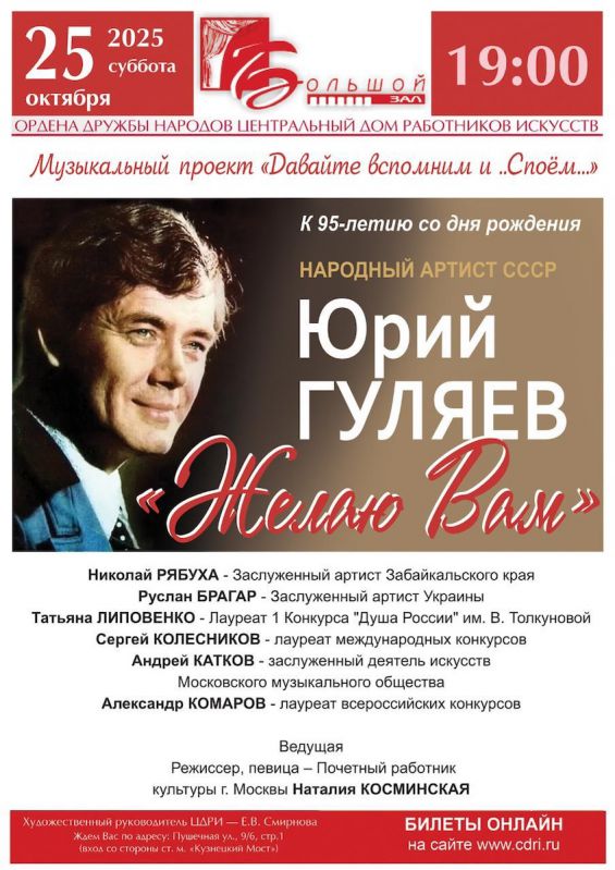 В 2025 году исполнилось бы 95 лет известному оперному и эстрадному певцу, композитору, народному артисту СССР Юрию Гуляеву (9.09.1930 -24.04.1986).