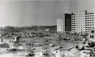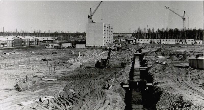 Строительство первого универсального магазина на фоне домов Нижневартовского и Гомельского ДСК |