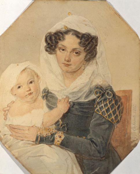 Семейным счастьем одарила судьба и графа Николая Дмитриевича Зубова (1801 – 1871). Но… недолгим. У него была красавица жена – в православии Александра Гавриловна, дочь французского эмигранта Раймона де Моден. Трое очаровательных детей – девочка Елизавета и двое мальчиков: старший Николай и младший Александр. И грянуло горе: умирает жена, оставив на руках безутешного мужа шестилетнюю Лизу, семилетнего Николая и младенца Сашу. Знаменитый график Ноэль, упоминаемый Пушкиным в «Евгении Онегине», создает по заказу графа Зубова исполненный печали семейный триптих в технике литографии с акварельного оригинала итальянского художника Росси.