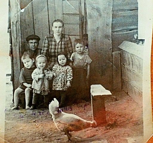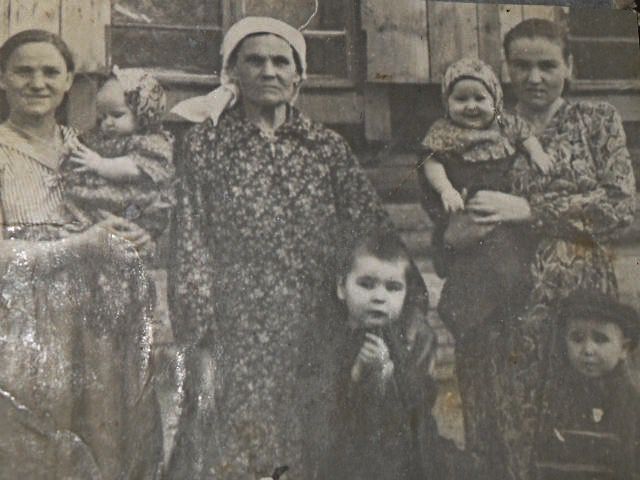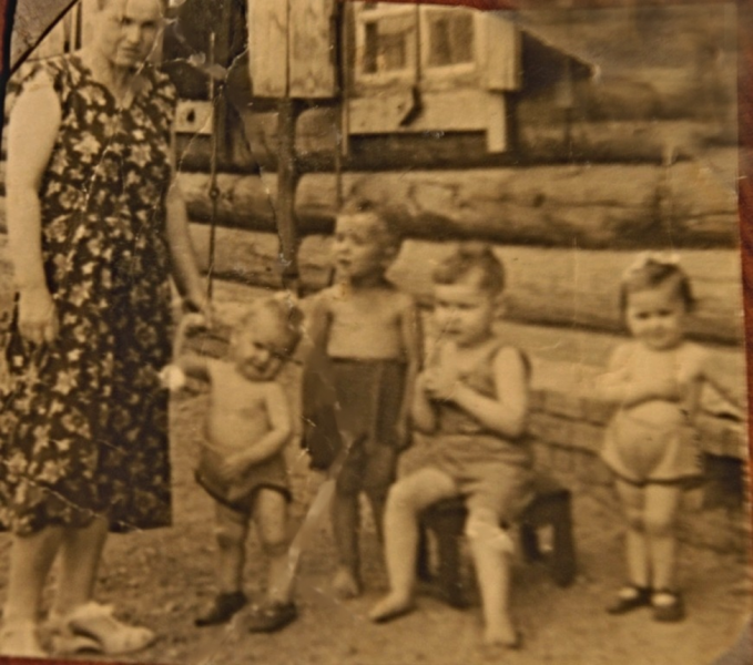 Слева направо: тетя Валя с Наташей, бабушка Прасковья с Олегом, мама Александра с Таней и Сергеем