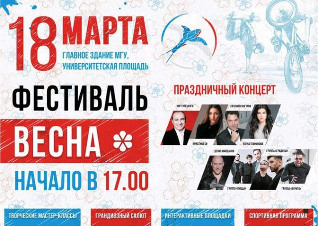 В субботу, 18 марта, в рамках фестиваля «Весна», приуроченного к годовщине воссоединения Крыма с Российской Федерацией, на Университетской площади перед главным зданием МГУ состоится грандиозный концерт ведущих российских музыкальных исполнителей.
