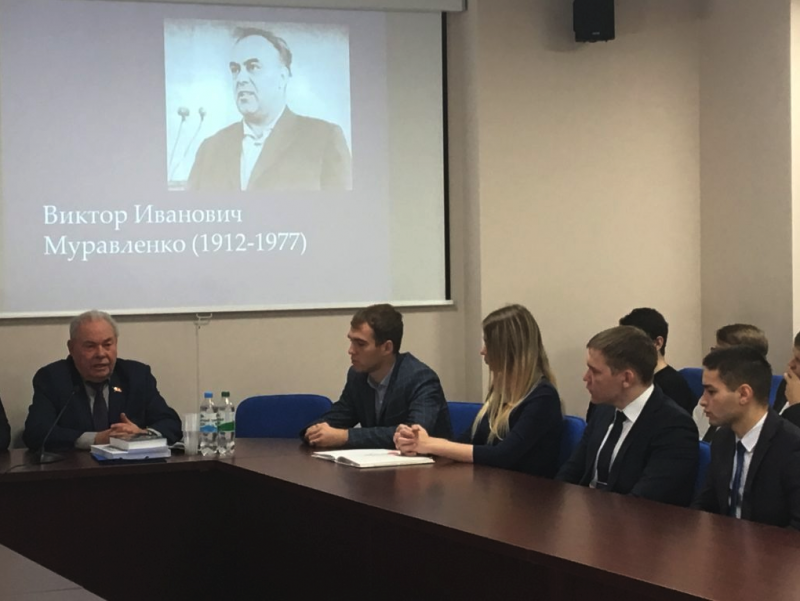 Как сообщает пресс-служба ТИУ, Сергей Дмитриевич рассказал ребятам о жизненном пути советского организатора нефтяной и газовой промышленности, руководителя крупнейшего предприятия СССР «Главтюменьнефтегаз» (в 1965 – 1977 годах) Виктора Ивановича Муравленко. Был показан фильм об этом выдающемся человеке, подготовленный на основе материалов Фонда (монтаж – С.А.Жаринов).