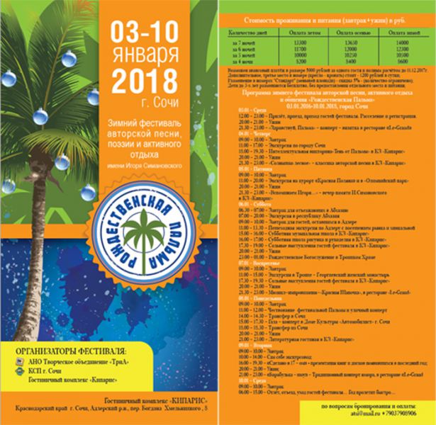 К участию в зимнем фестивале «Рождественская Пальма» приглашают самодеятельных авторов, композиторов, исполнителей, ансамбли, поэтов и слушателей,  изъявивших желание совместного организованного времяпровождения в компании друзей Игоря Симановского, десятков прекрасных поэтов и бардов, знающих его творчество. Для членов нашей организации сохраняются летние цены на путевки: atsi@mail.ru.  Справки по тел.: +7 (903) 790-89-06, +7 (963) 160-45-10 (Александр Цилькер).