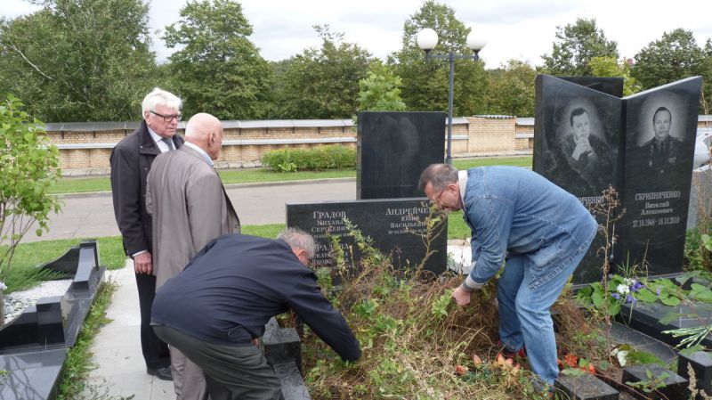 Возложили красные гвоздики к надгробным памятникам Георгию Альбертовичу Арендту, Владимиру Пантелеевичу Пивоварову, Петру Ивановичу Кузину, Валерию Анисимовичу Хорошеву, Леонарду Григорьевичу Ширяевскому, Юлию Васильевичу Андрейчеву, Арутюну Амбарцумовичу Будагяну, Илье Павловичу Варшавскому.