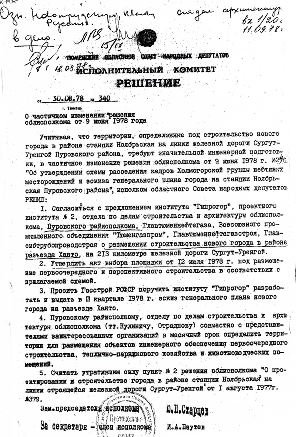 Несмотря на это предложение, Тюменский облисполком в 1977 году согласовал Акт выбора площадки, а Решением № 246 от  09.06.1978 г. утвердил схему генерального плана под город Ноябрьск на выбранной территории.