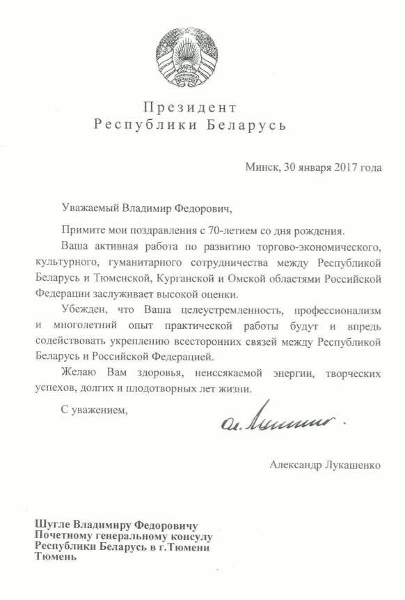 В настоящее время Вы Почетный консул Республики Беларусь в Российской Федерации, член Общественной палаты России от нашего региона,председатель Совета Тюменской областной общественной организации «Союз – интеграция братских народов». Вносите значительный вклад в развитие взаимовыгодных экономических связей между Тюменской областью и Беларусью. В результате заключен ряд прямых соглашений и увеличен экспорт белорусских товаров в наш регион и дальше на Восток.